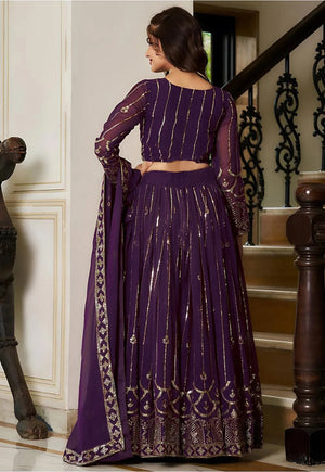 Make a stunning statement at any festive occasion or wedding celebration with this exquisite Designer Purple Embroidered Net Lehenga Choli Set. Crafted from high-quality net fabric, this ensemble features a beautifully embellished blouse with intricate golden zari and sequin embroidery. The blouse is designed with sheer full sleeves and a sweetheart neckline, adding a graceful and modern touch to the traditional silhouette.