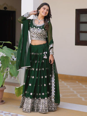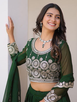 Step into elegance with this stunning emerald green lehenga choli, crafted to perfection for festive occasions and grand celebrations. The outfit features a beautifully embroidered georgette lehenga adorned with intricate mirror work and sequin detailing that exudes traditional charm with a modern touch. The wide flared hemline is designed with layered patterns, including floral and geometric motifs, giving it a rich and royal appeal.