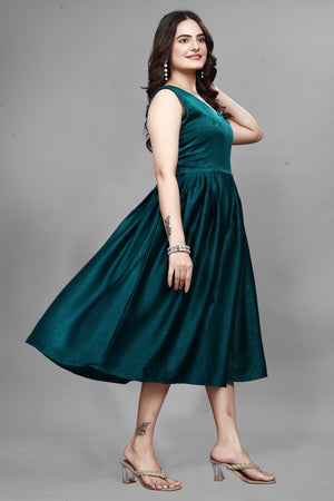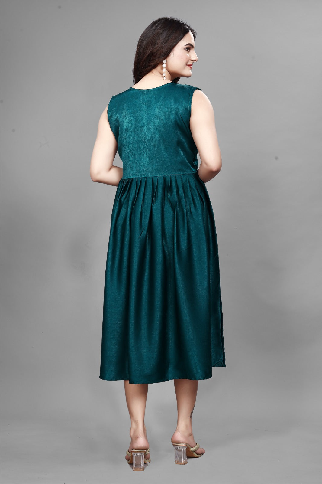 Shine with elegance in this Emerald Green Satin Fit & Flare Dress, tailored to make heads turn. Crafted from premium satin fabric, this sleeveless midi dress features a deep V-neckline, a flattering cinched waist, and a gracefully flared hem that gives you a stunning silhouette. Ideal for parties, dinners, or any special event, this dress combines luxury and style effortlessly.