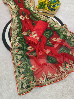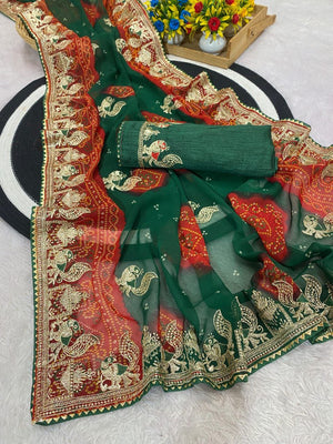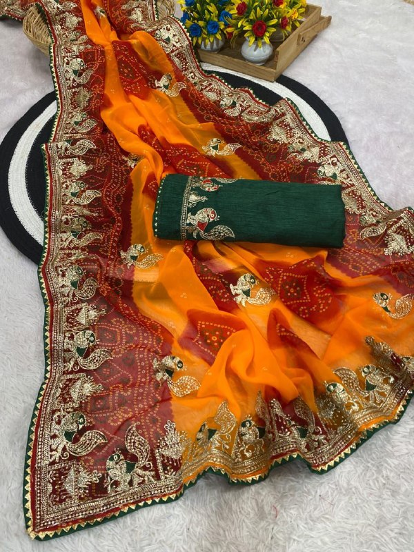 FABRIC : *saree fabric star georgette with beautiful C pallu zari embroidery work in all over saree with beautiful Peacock butta*