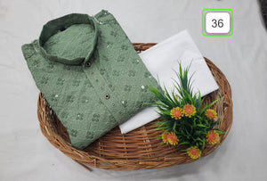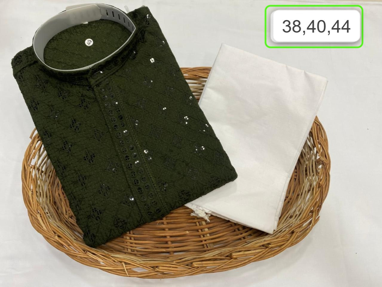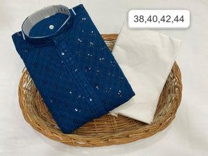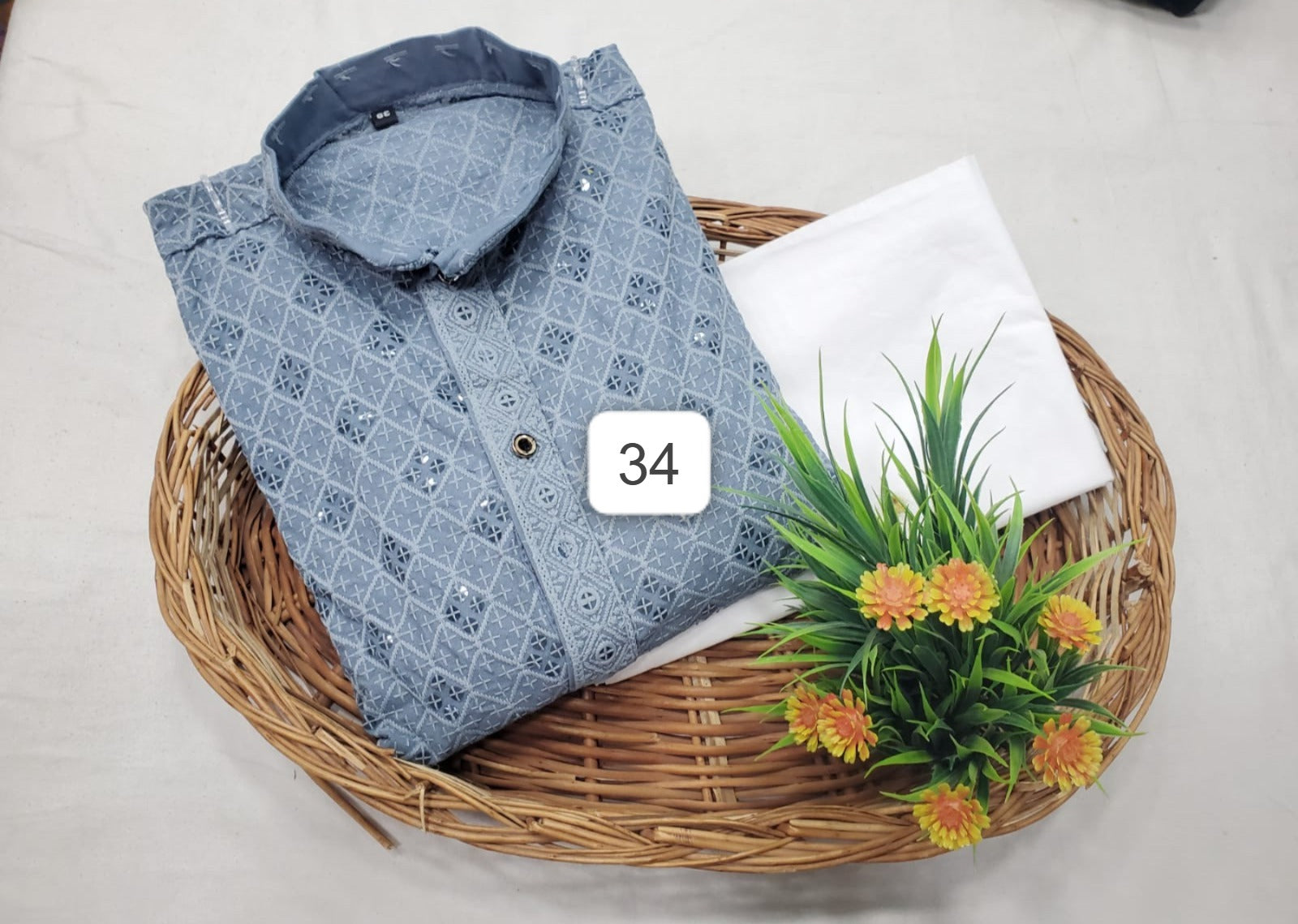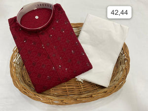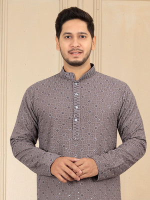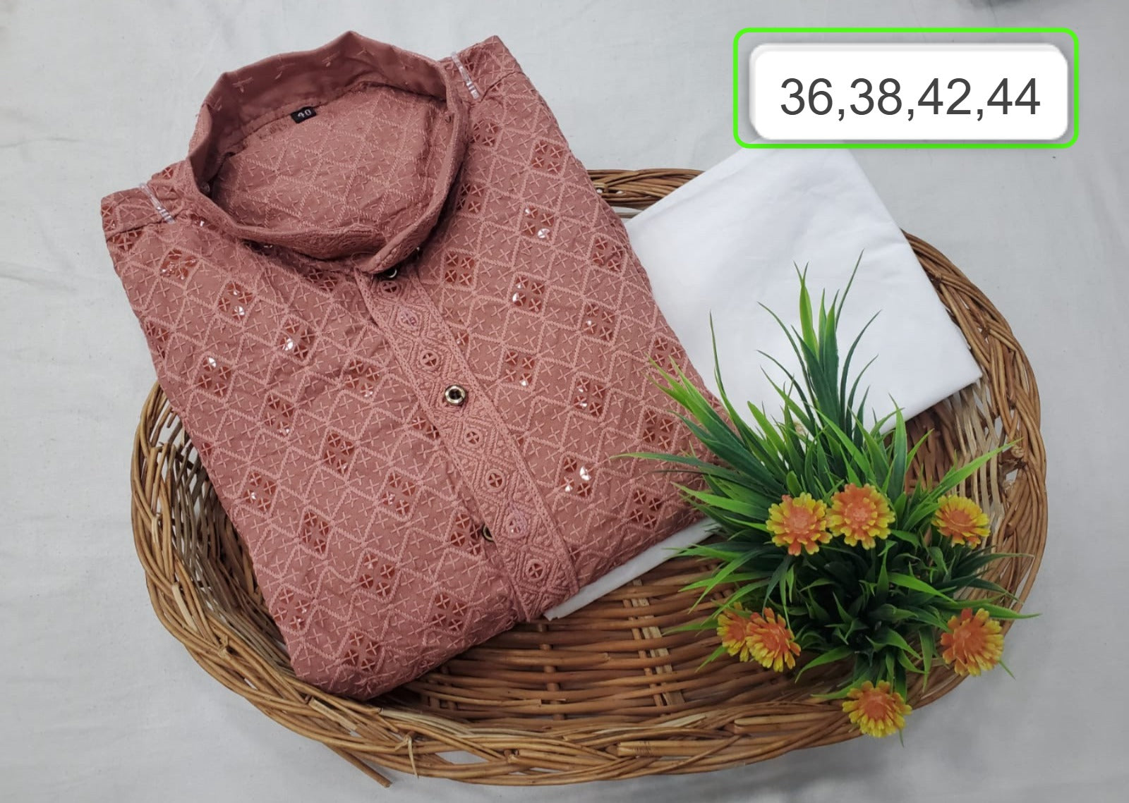 Elevate your traditional wardrobe with this elegantly designed men's embroidered kurta. Crafted from premium-quality fabric, this brown kurta features intricate geometric embroidery throughout, offering a refined and festive look. The straight-cut silhouette is enhanced with a classic mandarin collar and a buttoned placket for added charm. Paired with crisp white pajama trousers, this outfit is perfect for festive occasions, weddings, or cultural events. Complete your ethnic ensemble with traditional footwear for a timeless appearance.