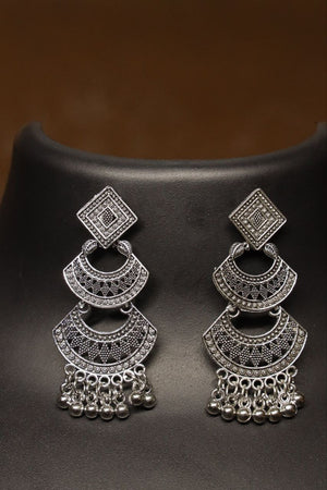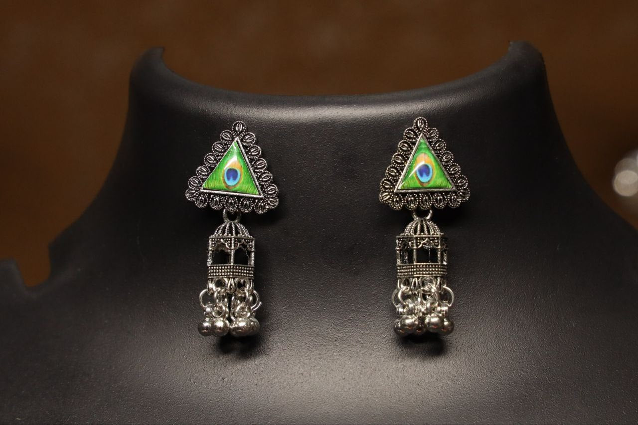 Oxidised Silver Triangle Peacock Feather Jhumka Earrings for Women & Girls