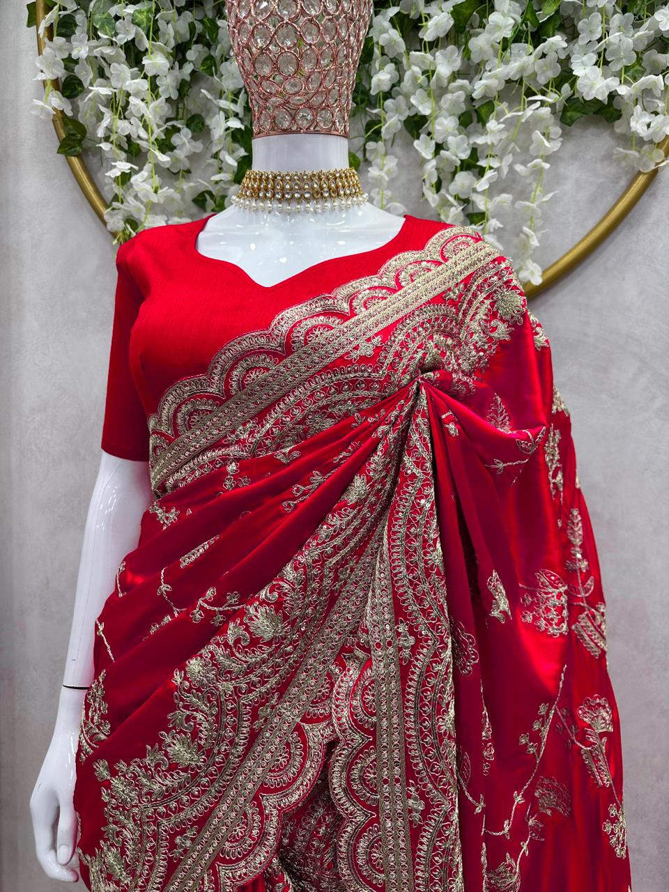 Turn heads with this Regal Red Embroidered Bridal Saree, a masterpiece crafted for timeless elegance and grand celebrations. This luxurious saree features a vibrant red base adorned with intricate golden zari embroidery, floral motifs, and a lavish scalloped border that adds an extra touch of royalty.