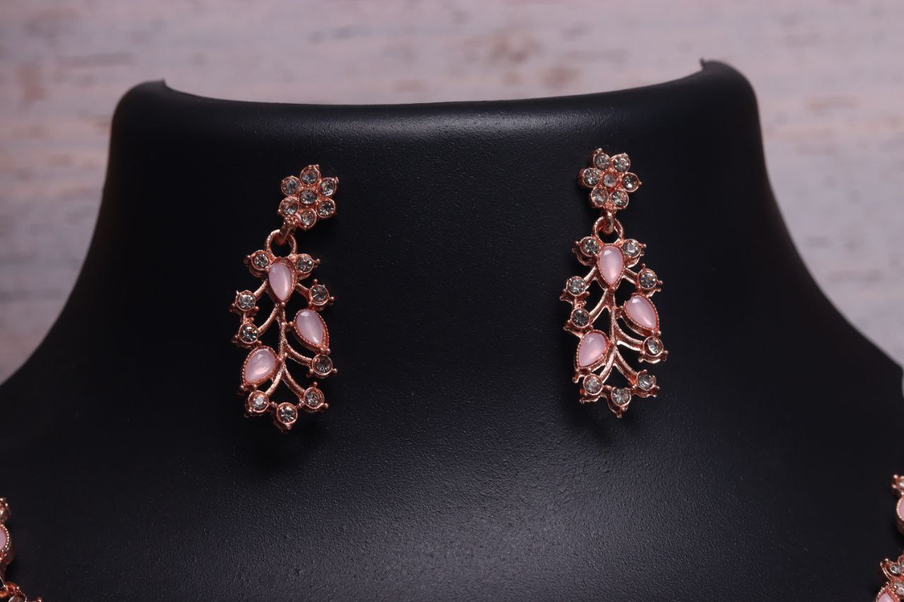 Perfect for parties, weddings, or special occasions, this lightweight necklace comes with matching earrings to complete your stylish look. The rose gold finish and soft pastel tones make it an ideal accessory for both western and ethnic outfits.