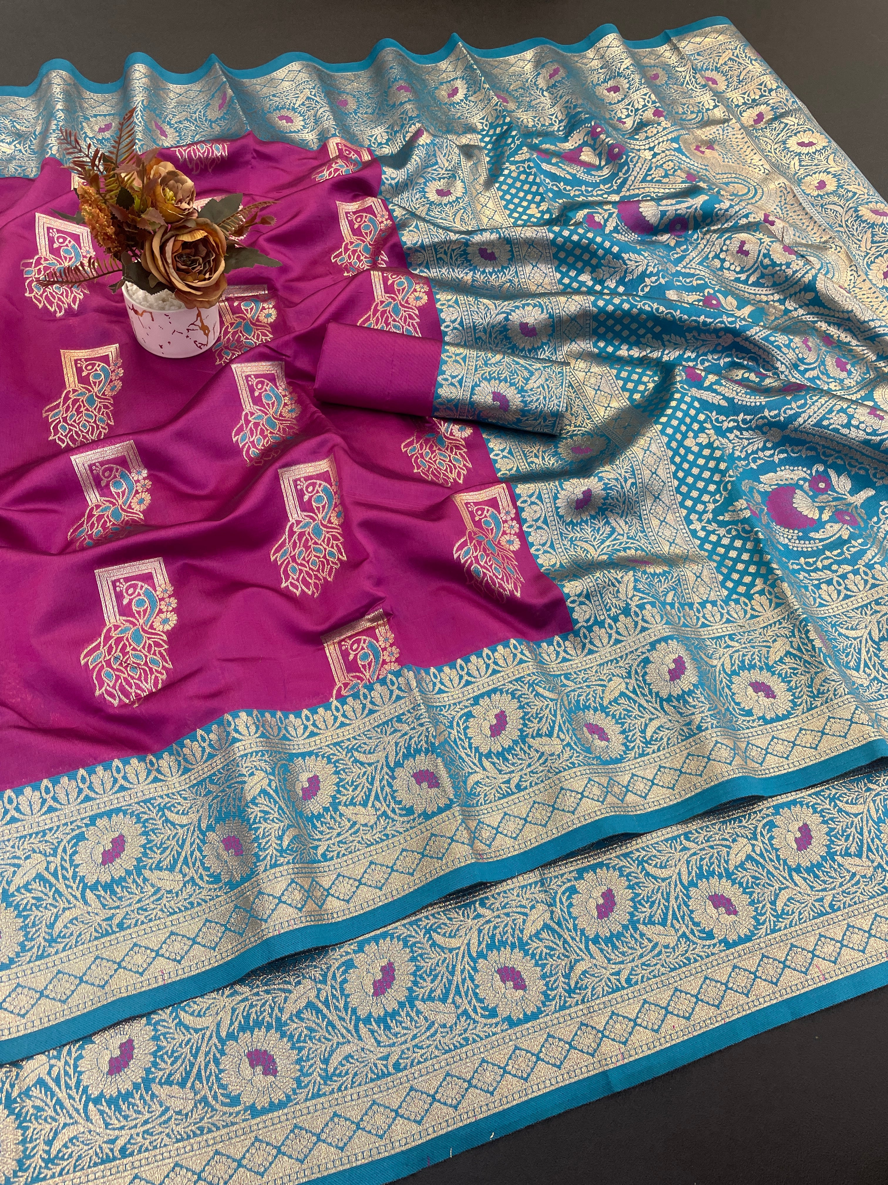 Saree: Soft Pethani silk saree with zari weavingĀ design and MeenakariĀ weaving Rich pallu with Meenakari weaving border.