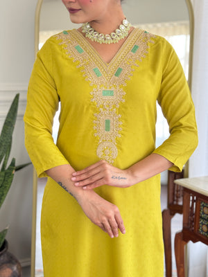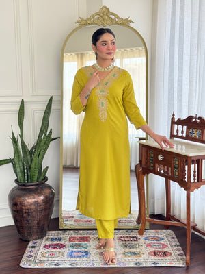 Bring brightness and elegance to your ethnic wardrobe with this radiant yellow kurta set. The kurta features intricate mirror work and embroidery on the neckline, paired with a lightweight organza dupatta finished with elegant tassel detailing. The ensemble is perfect for festive celebrations and summer occasions.