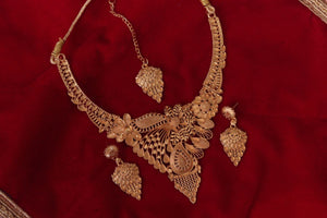 Traditional Antique Gold-Plated Floral Necklace Set with Matching Earrings and Maang Tikka