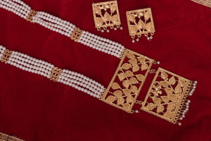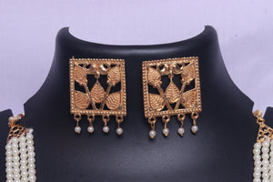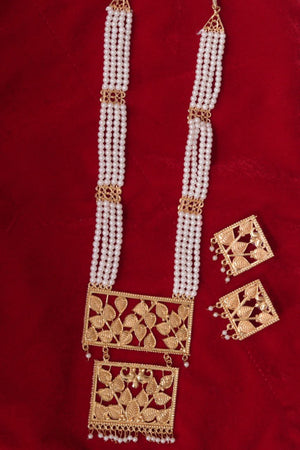 Traditional Pearl Beaded Temple Design Necklace Set with Gold-Plated Leaf Motif Pendants & Earrings