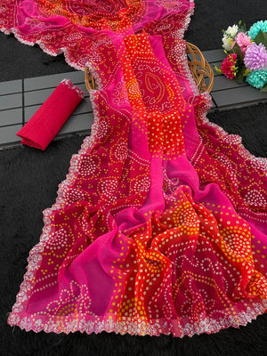 Vibrant Pink & Red Bandhani Georgette Saree with Lace Borde
